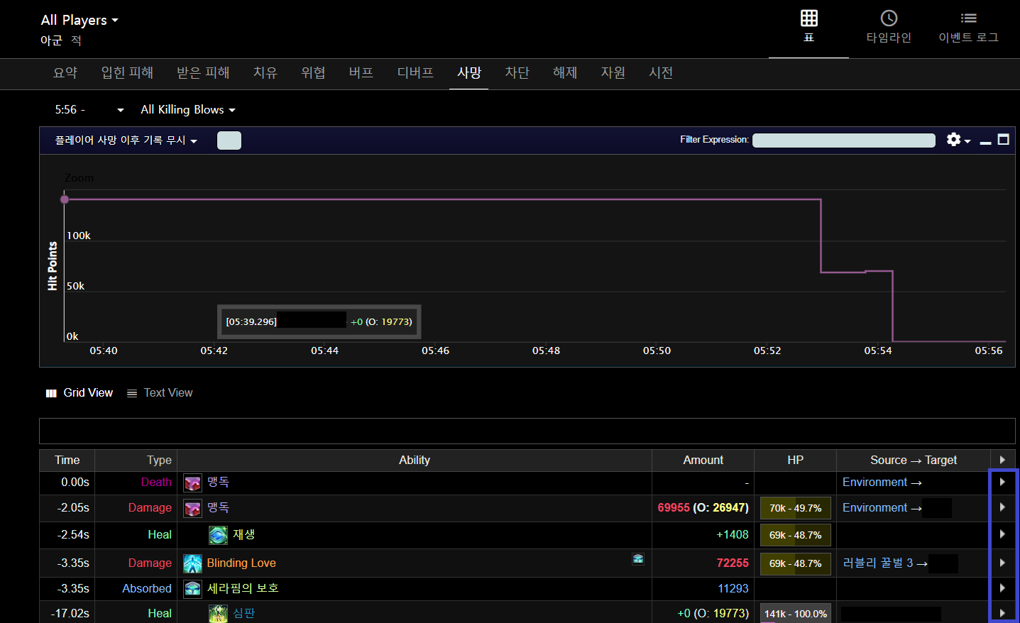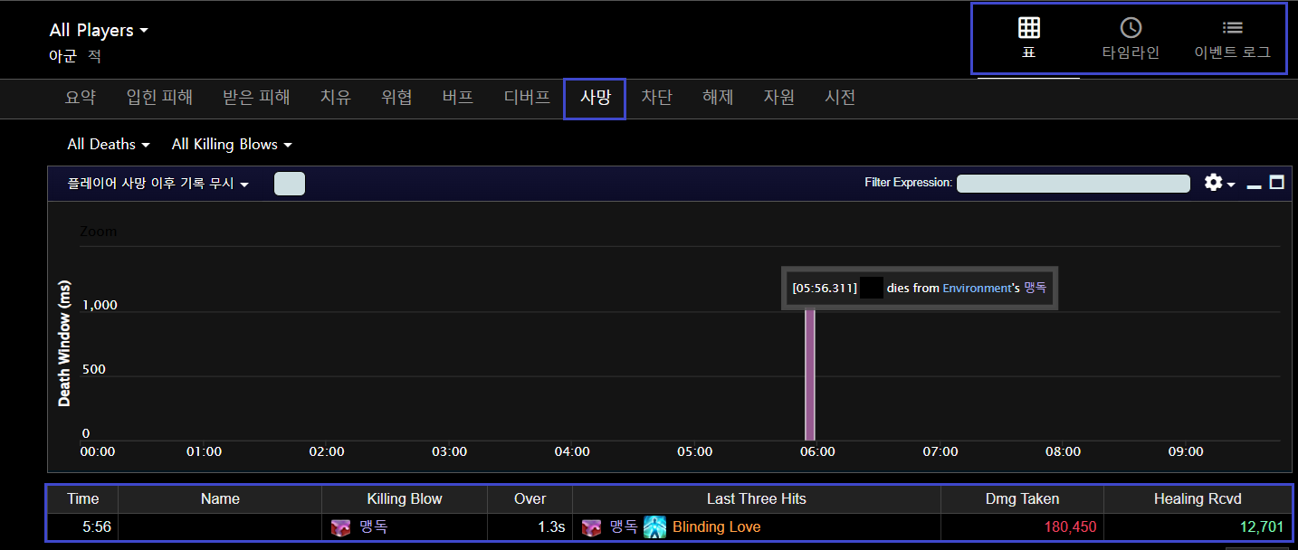 위의 예시 이미지를 분석하면, 5분 56초 쯤에 기믹 실수로 파티원이 맹독 대미지를 받고 사망한 것이죠.