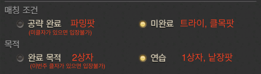 - 매칭 조건 : 공략완료(클리어 전적이 있는 사람, 클자) / 미완료(한 번도 클리어 전적이 없는 사람, 미클자)