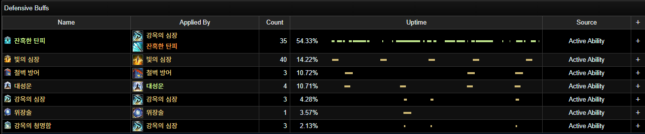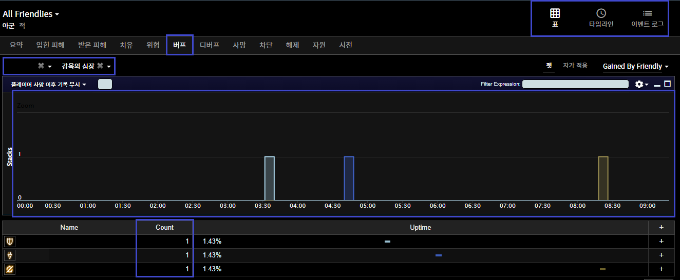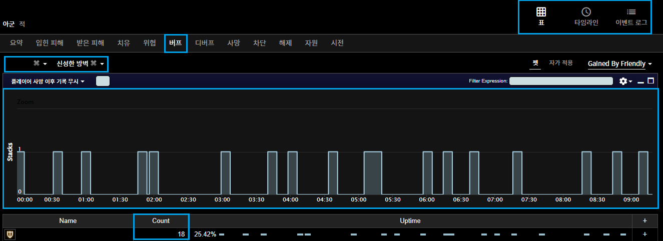 상단의 버프 탭을 클릭 후 확인할 파티원과 생존기를 선택하면 아래처럼 사용 횟수 / 사용 시간이 전부 뜹니다.