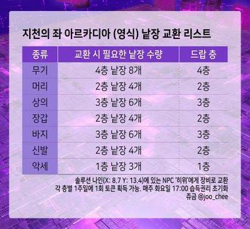 각 층마다 주 1회에 아이템으로 교환 가능한 토큰(낱장)을 줍니다. 낱장으로 아이템을 교환할 경우 '정가'라고 표현합니다.