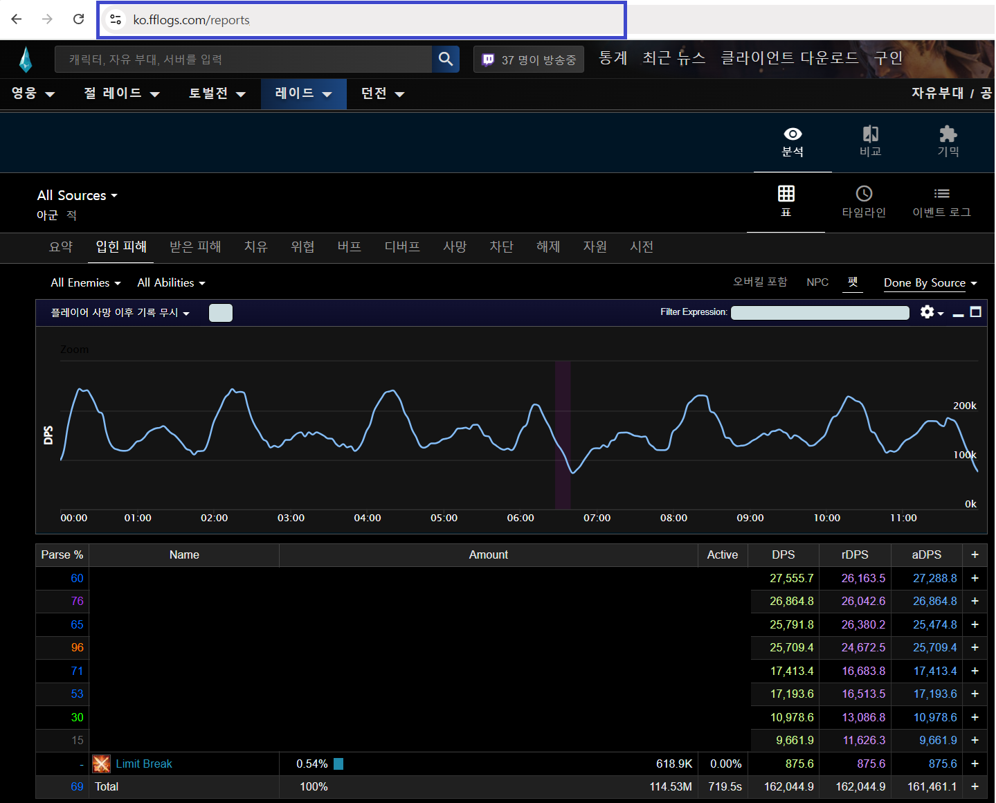 아래에 보시면 평균 DPS도 수치로 표시되어있고, 현재 등록되어있는 로그 수도 보여줍니다.