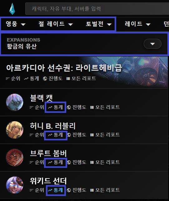 프프로그 사이트에서 원하는 레이드의 메뉴를 선택하고, 그 중 '통계' 를 클릭합니다.